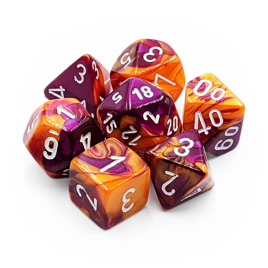 Set of Polyhedral Dice from Chessex for classic tabletop RPG and Board Games. Each die comes in an elemental colour with contrasting numbers.