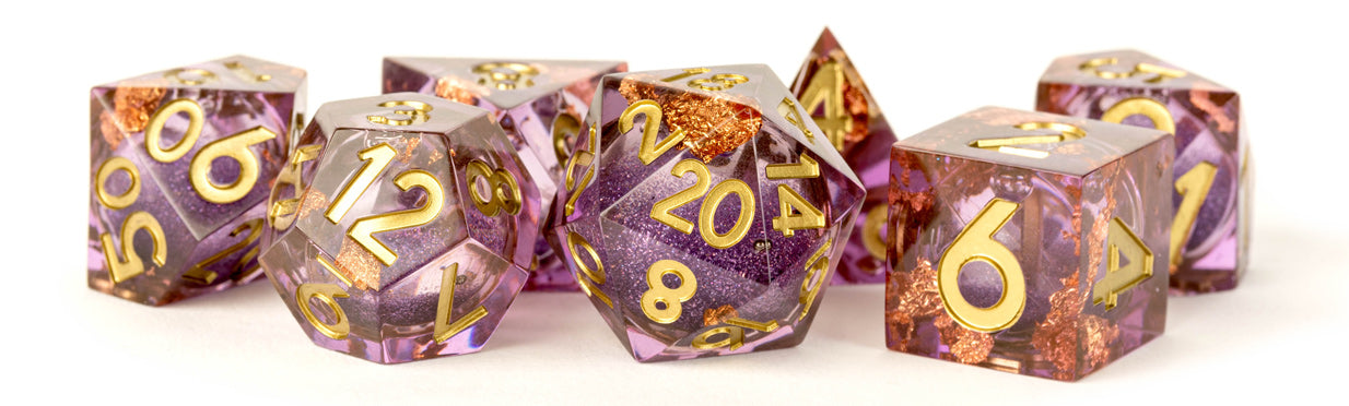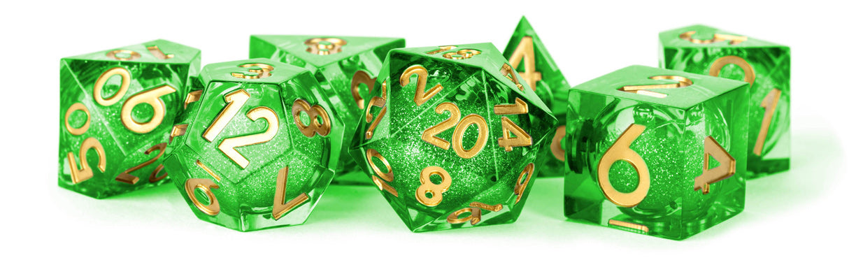 Elixir dice are infused with glittery liquid cores that swirl when rolled. Each set is handcrafted and polished to keep their beautiful sharp edges. When the liquid cores are molded into the dice, the heat from molding creates a small bubble in the liquid core.